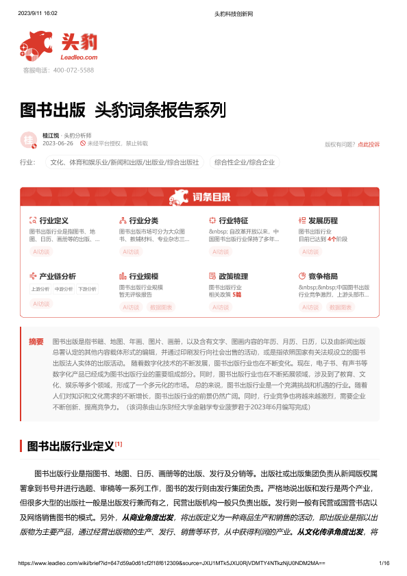 【头豹研究院】【202309】图书出版 头豹词条报告系列-16页