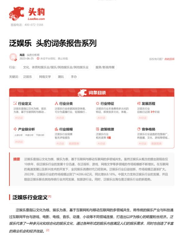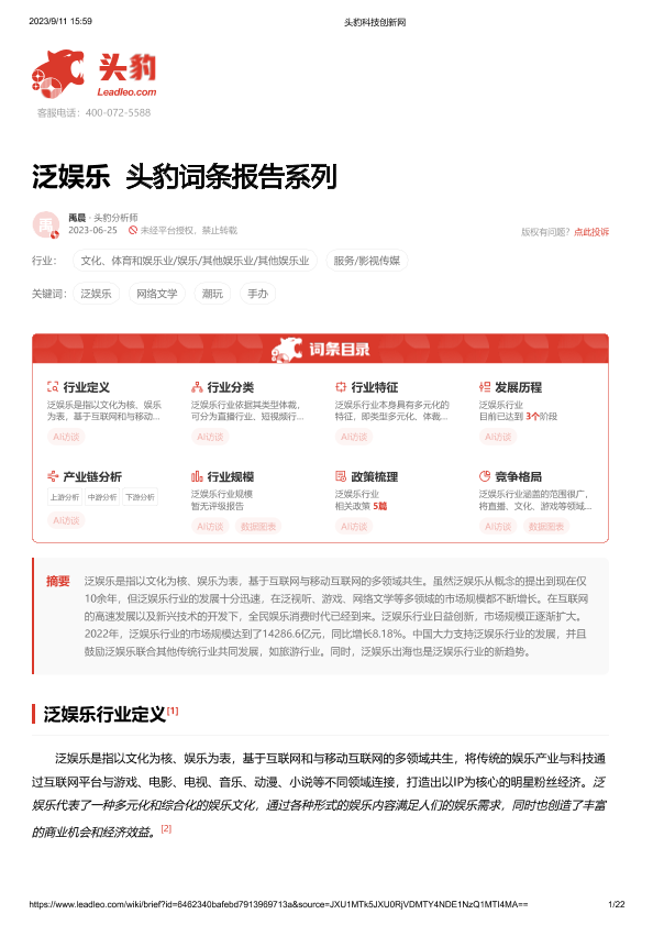 【头豹研究院】【20230920】泛娱乐 头豹词条报告系列-22页