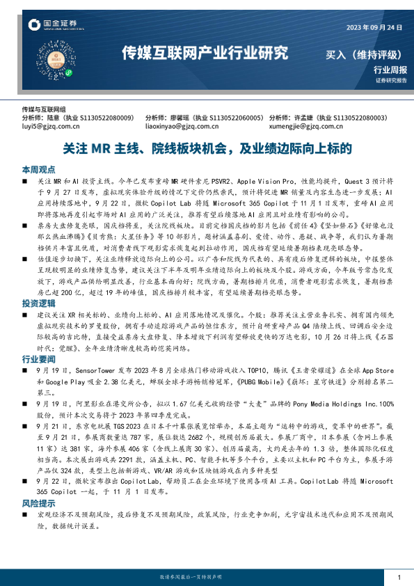 【国金证券】【20230924】传媒互联网产业行业研究:关注MR主线、院线板块机会,及业绩边际向上标的-23页