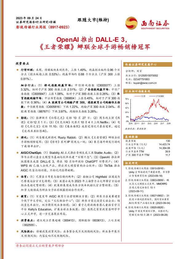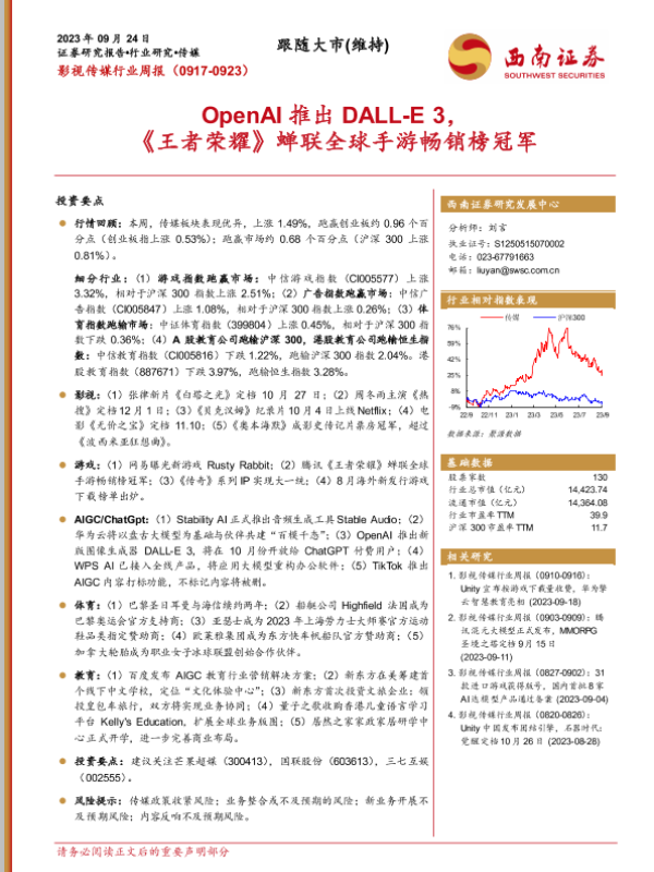 【西南证券】【20230924】影视传媒行业周报:OpenAI推出DALL-E3,《王者荣耀》蝉联全球手游畅销榜冠军-20页