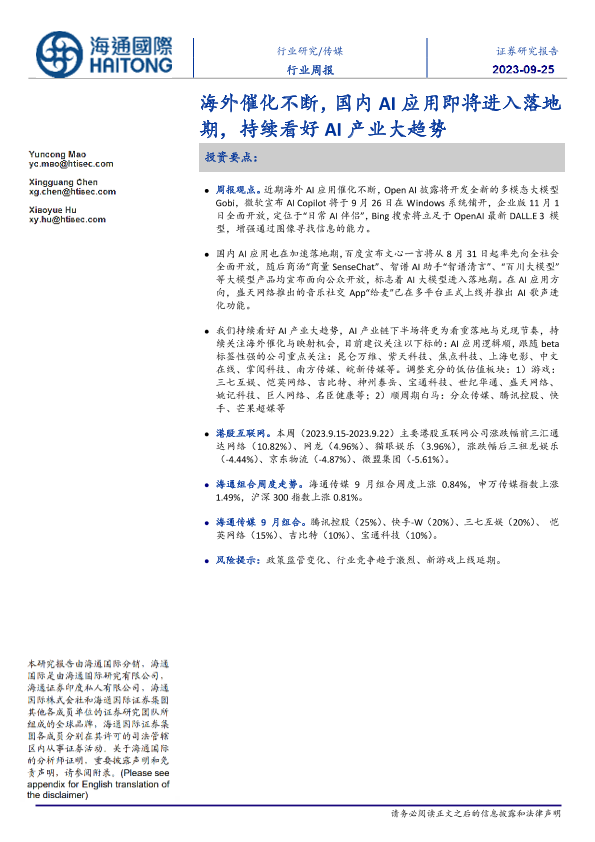 【海通国际】【20230925】传媒行业周报:海外催化不断,国内AI应用即将进入落地期,持续看好AI产业大趋势-15页