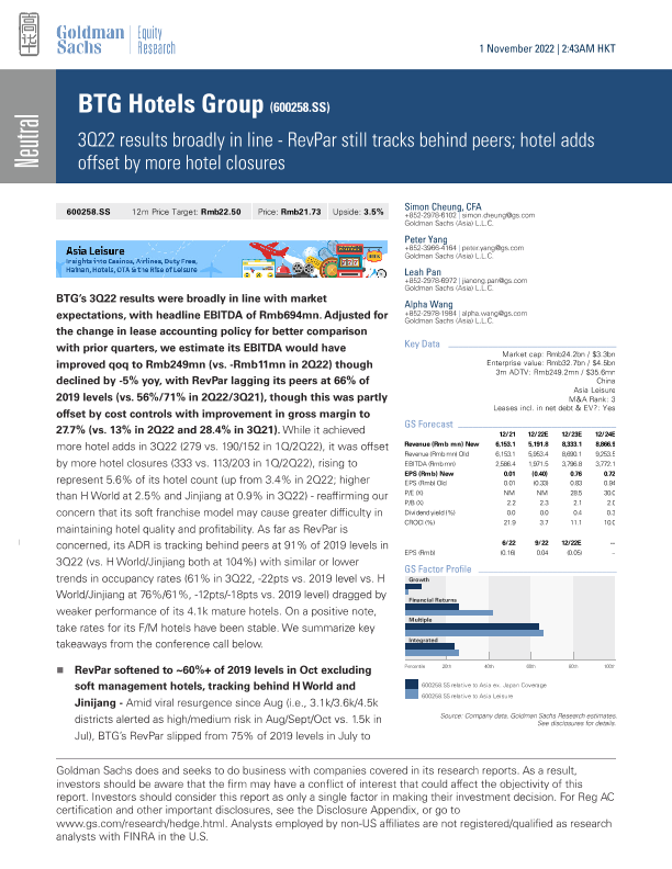 【Goldman Sachs】【20221101】BTG Hotels Group 3Q22业绩基本符合预期 - RevPar仍落后于同行;新开酒店被更多关闭所抵消-12页