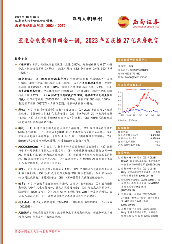 【西南证券】【20231007】影视传媒行业周报:亚运会电竞项目四金一铜,2023年国庆档27亿票房收官-19页
