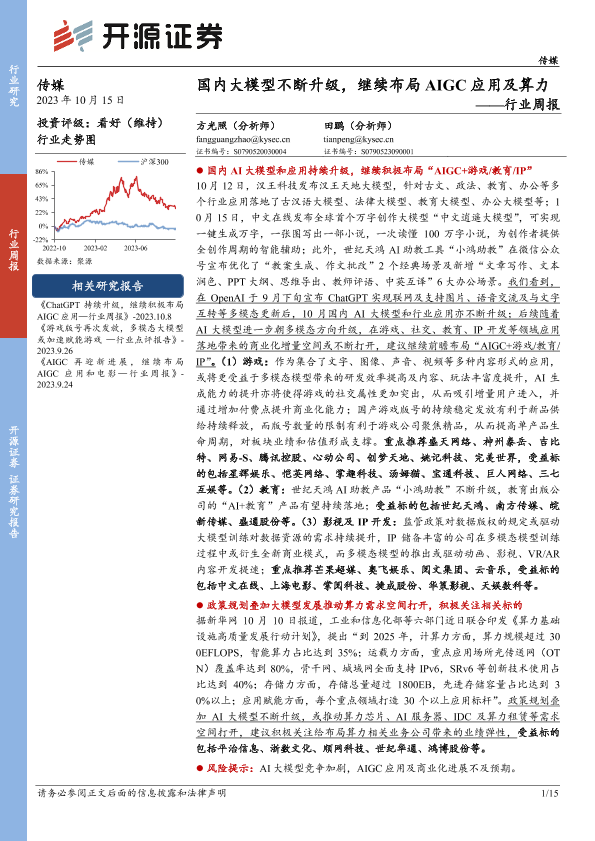 【开源证券】【20231015】传媒行业周报:国内大模型不断升级,继续布局AIGC应用及算力-15页
