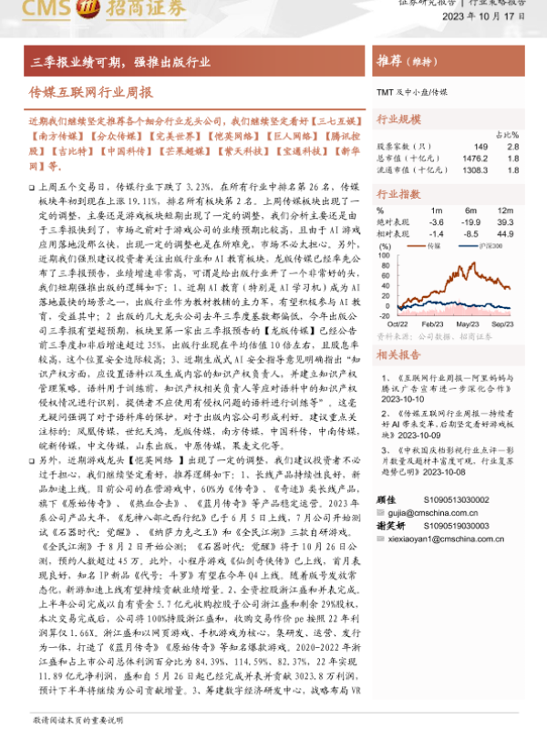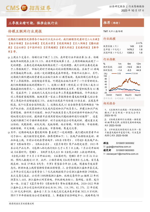 【海通证券】【20231017】传媒互联网行业周报:三季报业绩可期,强推出版行业-13页
