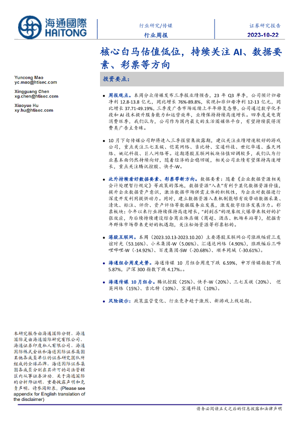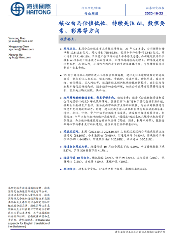 【海通国际】【20231022】传媒行业周报:核心白马估值低位,持续关注AI、数据要素、彩票等方向-16页