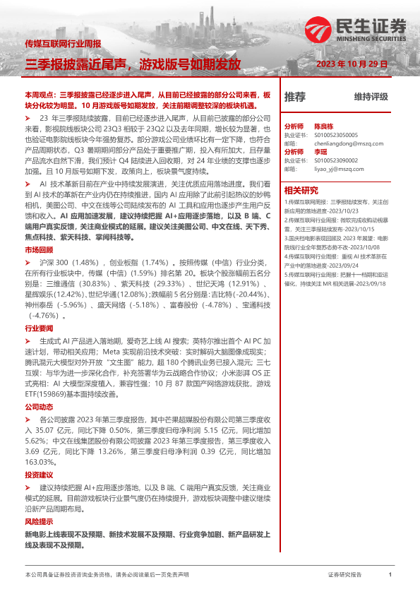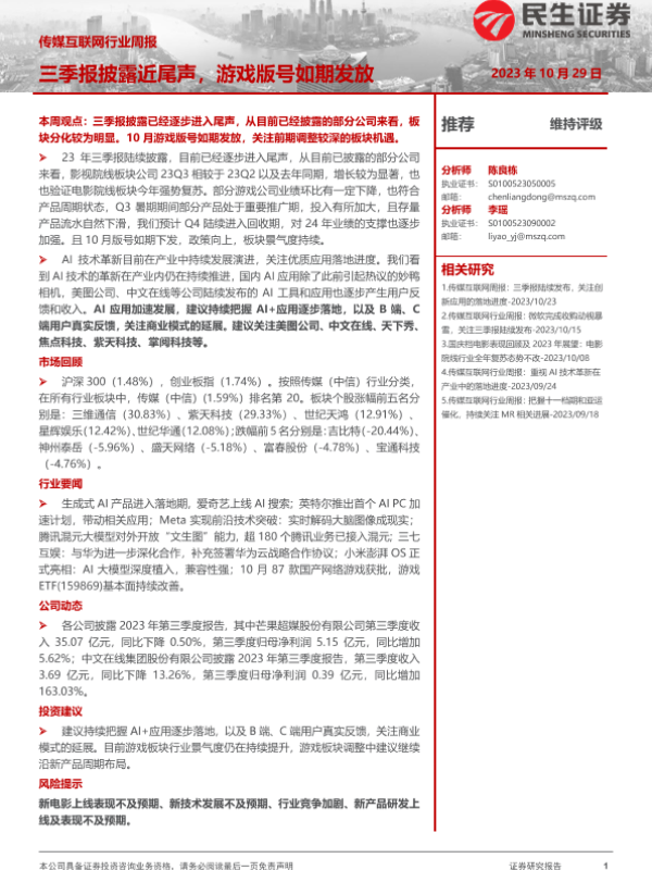 【民生证券】【20231029】传媒互联网行业周报:三季报披露近尾声,游戏版号如期发放-20页