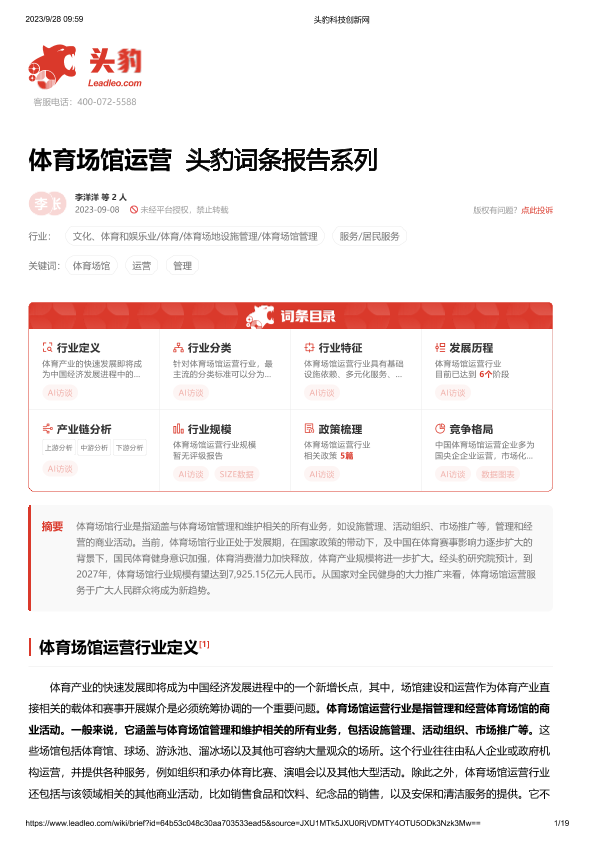 【头豹研究院】【202309】体育场馆运营 头豹词条报告系列-19页