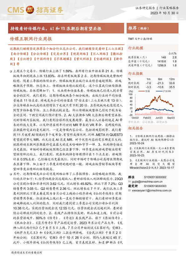 【海通证券】【20231030】传媒互联网行业周报:持续看好传媒行业,AI和VR浪潮后期有望共振-12页
