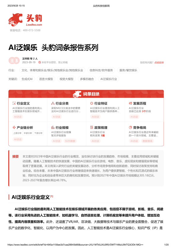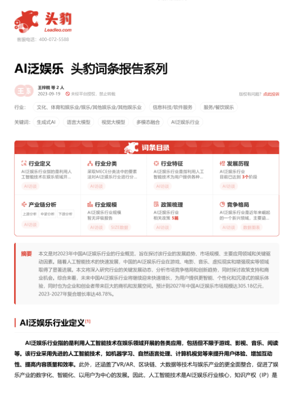 【头豹研究院】【202309】AI泛娱乐 头豹词条报告系列-20页