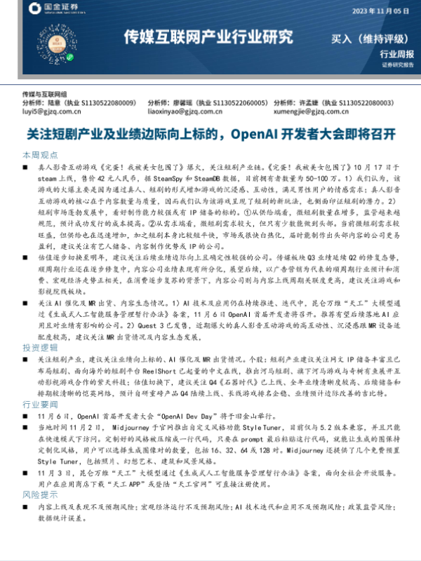 【国金证券】【20231105】传媒互联网产业行业研究:关注短剧产业及业绩边际向上标的,OpenAI开发者大会将召开-22页