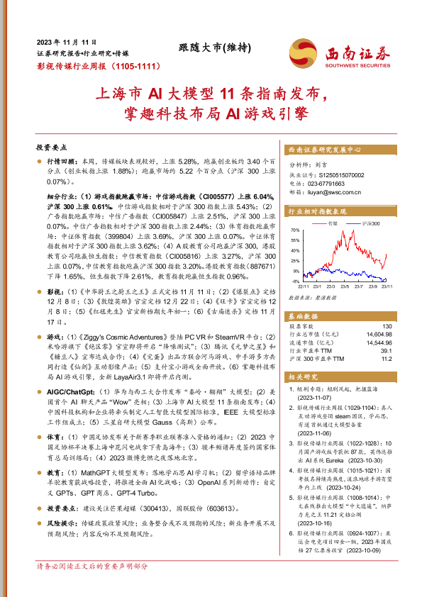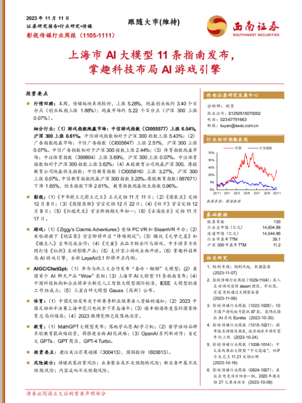 【西南证券】【20231111】影视传媒行业周报:上海市AI大模型11条指南发布,掌趣科技布局AI游戏引擎-20页
