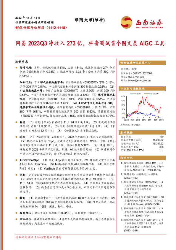【西南证券】【20231118】影视传媒行业周报:网易2023Q3净收入273亿,抖音测试首个图文类AIGC工具-21页