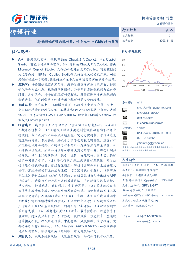 【广发证券】【20231119】传媒行业投资策略周报:抖音测试视频内容付费,快手双十一GMV增长显著-21页