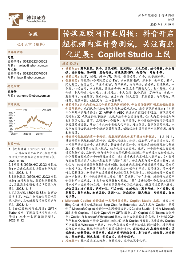 【德邦证券】【20231119】传媒互联网行业周报:抖音开启短视频内容付费测试,关注商业化进展;Copilot Studio上线-19页