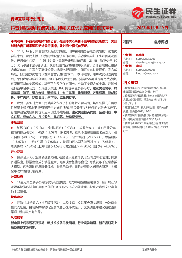 【民生证券】【20231119】传媒互联网行业周报:抖音测试视频付费功能,持续关注优质应用的模式革新-17页