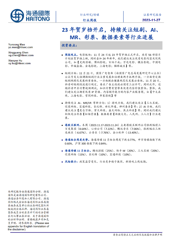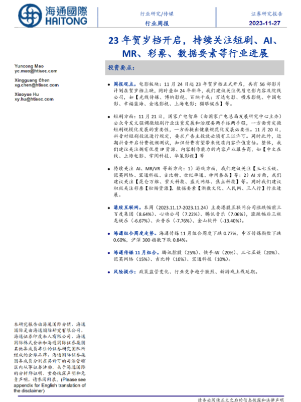 【海通国际】【20231127】23年贺岁档开启,持续关注短剧、AI、MR、彩票、数据要素等行业进展-16页