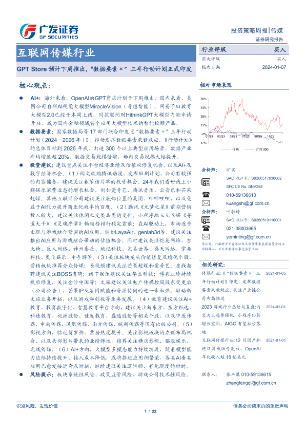 【广发证券】【20240107】互联网传媒行业投资策略周报:GPT Store预计下周推出,“数据要素×”三年行动计划正式印发-22页