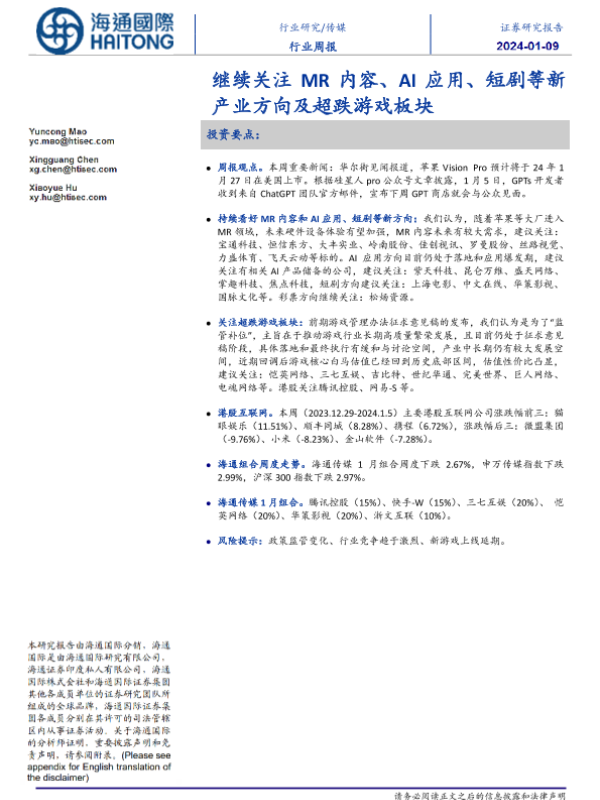 【海通国际】【20240109】传媒行业周报:继续关注MR内容、AI应用、短剧等新产业方向及超跌游戏板块-16页