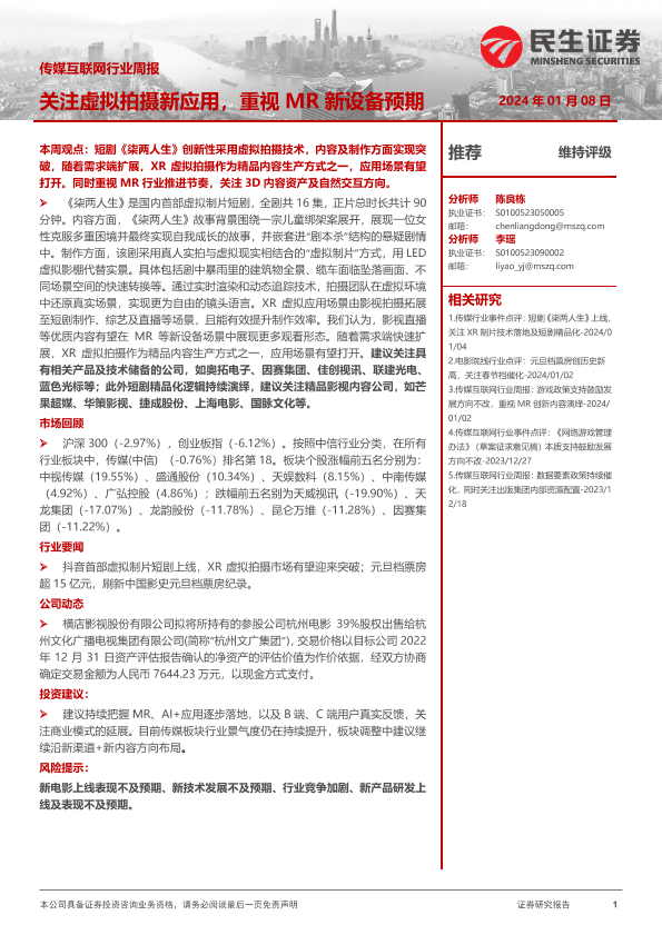 【民生证券】【20240108】传媒互联网行业周报:关注虚拟拍摄新应用,重视MR新设备预期-16页