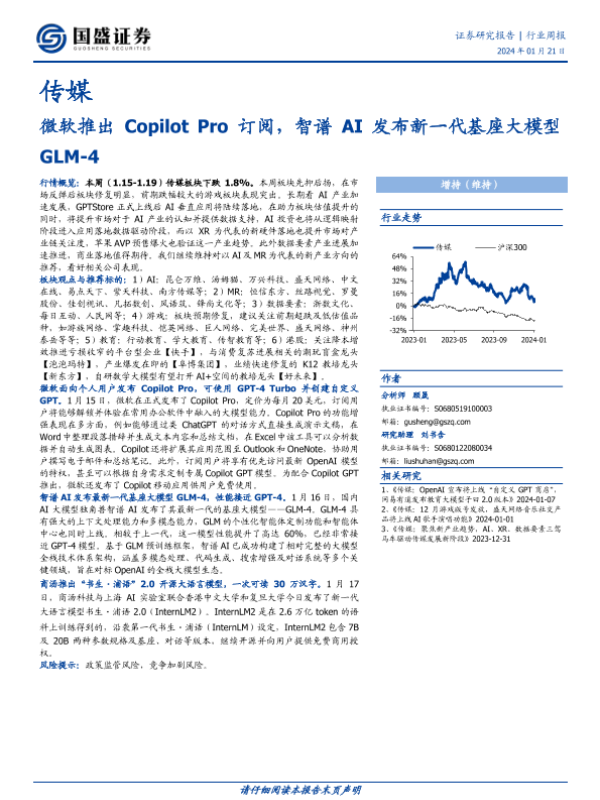【国盛证券】【20240121】微软推出Copilot Pro订阅,智谱AI发布新一代基座大模型GLM-4-11页