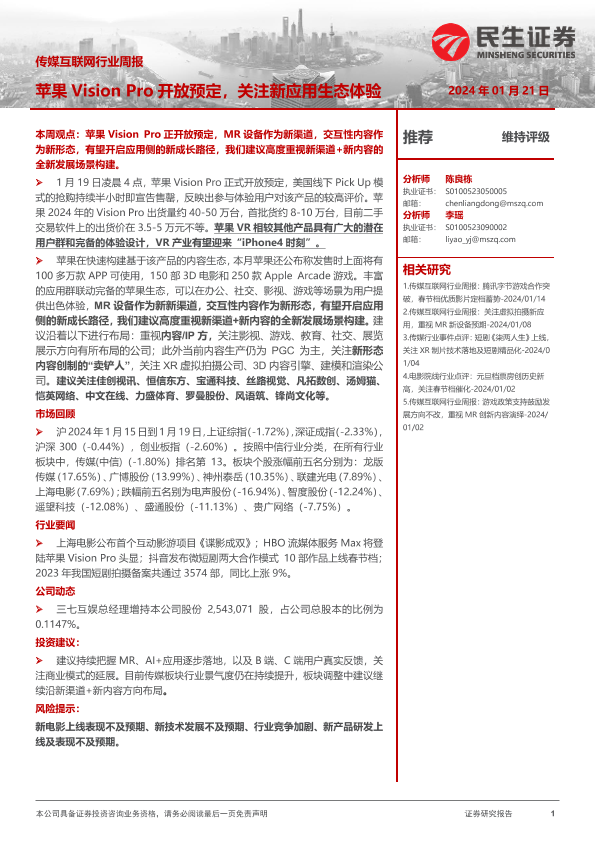 【民生证券】【20240121】传媒互联网行业周报:苹果Vision Pro开放预定,关注新应用生态体验-17页