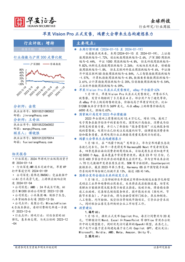 【华安证券】【20240121】全球科技行业周报:苹果Vision Pro正式发售,鸿蒙大会带来生态构建想象力-23页