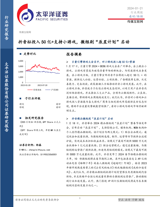【太平洋证券】【20240121】传媒互联网行业周报:抖音拟投入50亿+支持小游戏,微短剧“辰星计划”启动-24页
