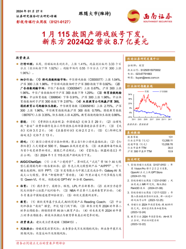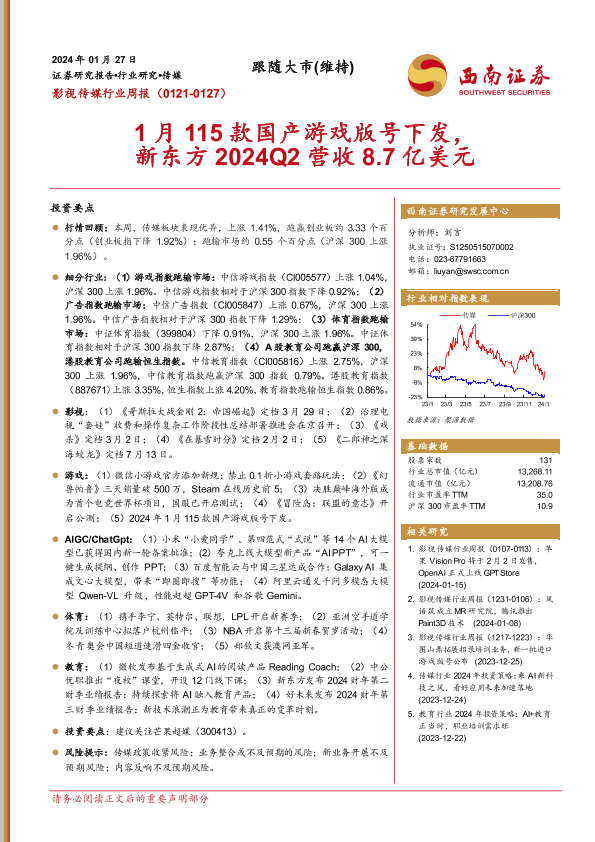 【西南证券】【20240127】影视传媒行业周报:1月115款国产游戏版号下发,新东方2024Q2营收8.7亿美元-20页