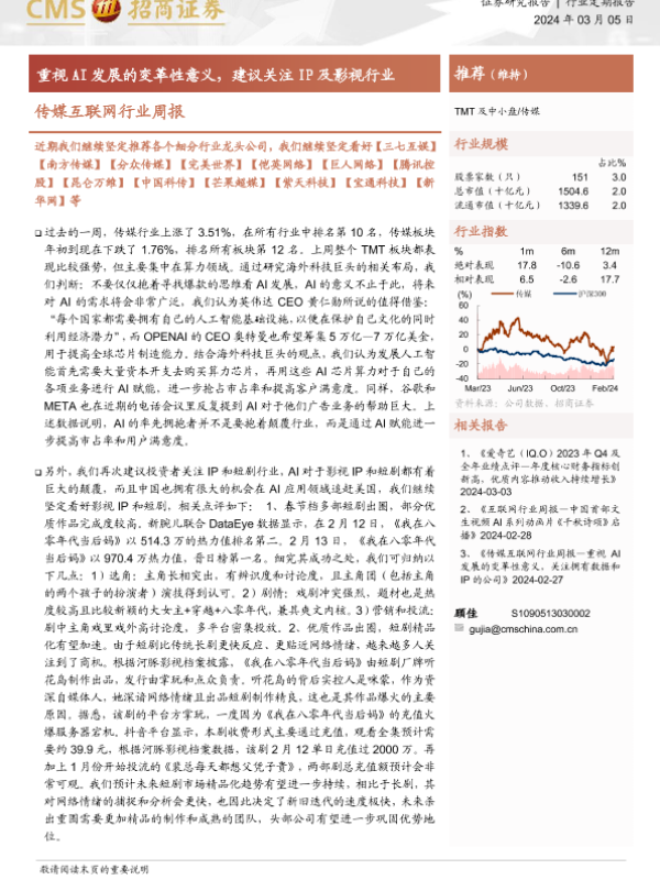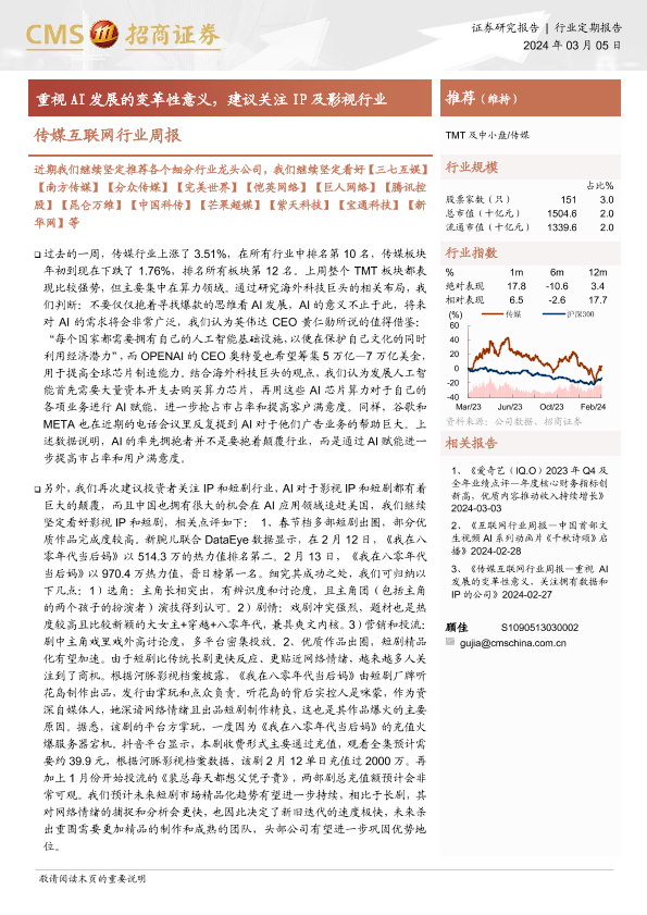 【海通证券】【20240305】传媒互联网行业周报:重视AI发展的变革性意义,建议关注IP及影视行业-12页