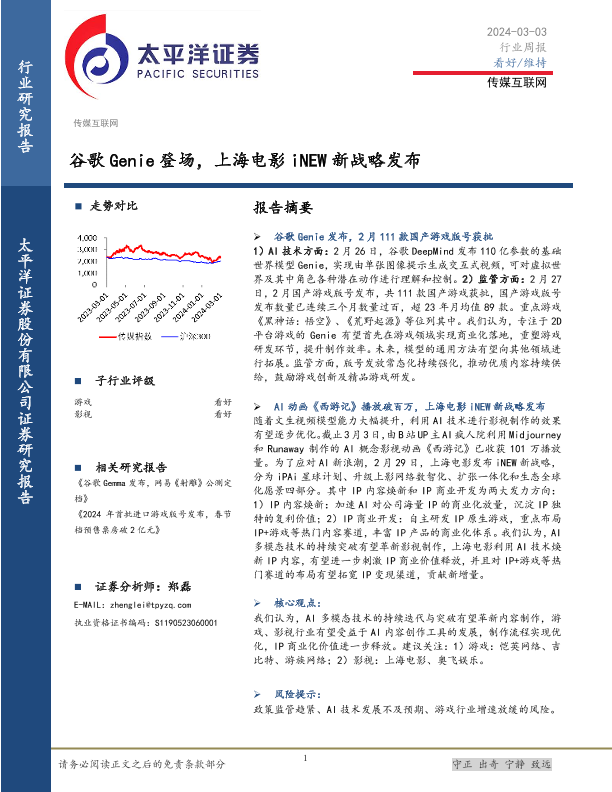【太平洋证券】【20240303】传媒互联网行业周报:谷歌Genie登场,上海电影iNEW新战略发布-27页