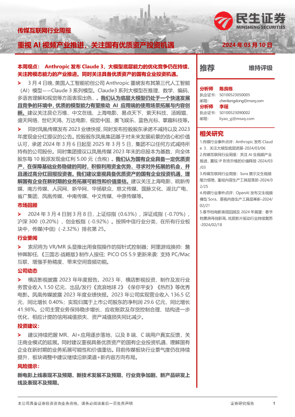 【民生证券】【20240310】传媒互联网行业周报:重视AI视频产业推进,关注国有优质资产投资机遇-16页