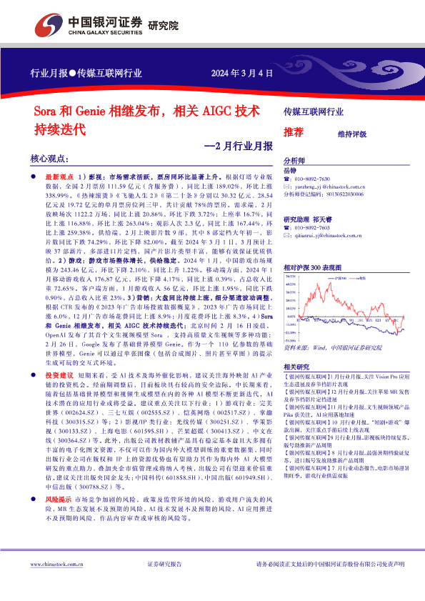 【银河证券】【20240304】传媒互联网行业2月行业月报:Sora和Genie相继发布,相关AIGC技术持续迭代-36页