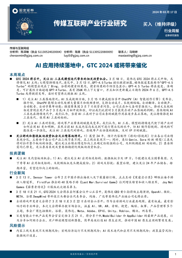 【国金证券】【20240317】传媒互联网产业行业周报:AI应用持续落地中,GTC 2024或将带来催化-15页