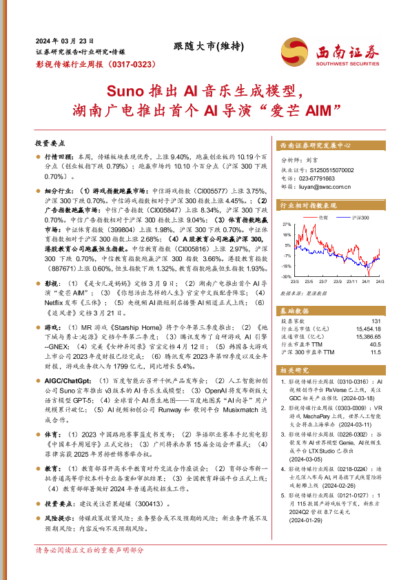 【西南证券】【20240323】影视传媒行业周报:Suno推出AI音乐生成模型,湖南广电推出首个AI导演“爱芒AIM”-20页