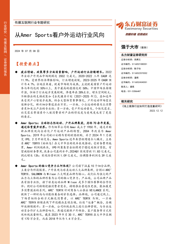 【东方财富证券】【20240708】从Amer Sports看户外运动行业风向-22页