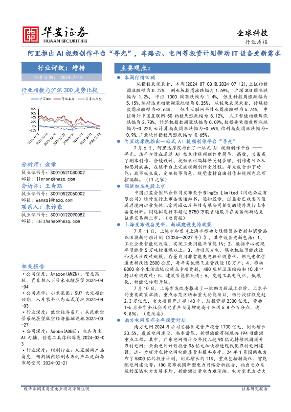 【华安证券】【20240714】全球科技行业周报:阿里推出AI视频创作平台“寻光”,车路云、电网等投资计划带动IT设备更新需求-24页
