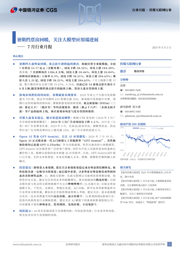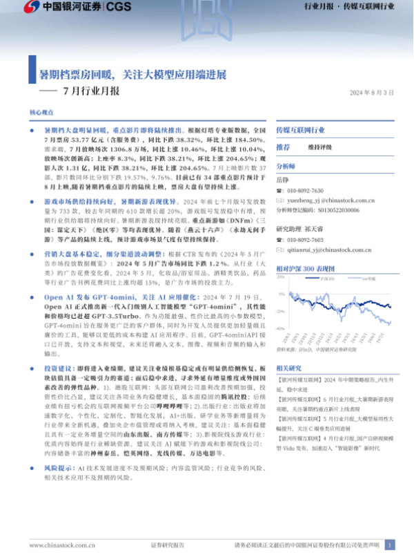 AI模型 传媒互联网 广告投放 暑期档票房 游戏市场