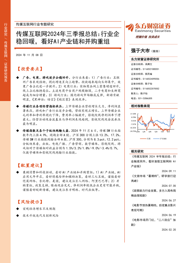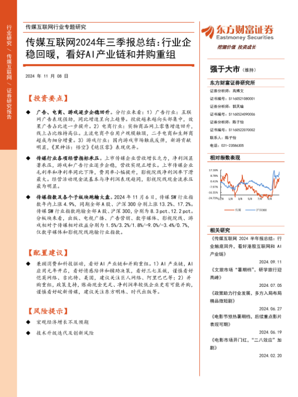 【东方财富证券】【20241108】传媒互联网2024年三季报总结:行业企稳回暖,看好AI产业链和并购重组-18页