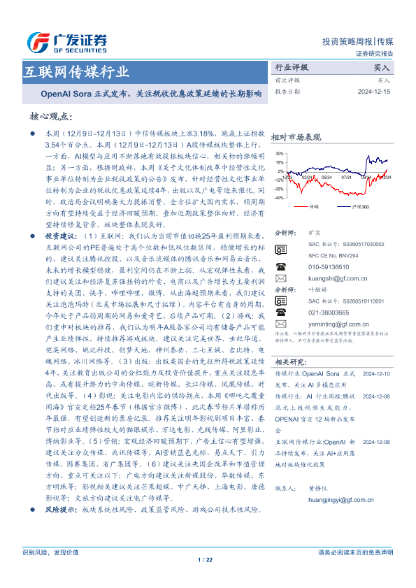 【广发证券】【20241215】互联网传媒行业投资策略周报:OpenAI Sora正式发布,关注税收优惠政策延续的长期影响-22页