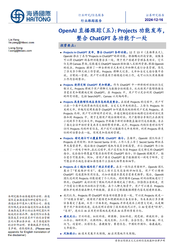 【海通国际】【20241216】OpenAI直播跟踪(五):Projects功能发布,整合ChatGPT各功能于一处-10页