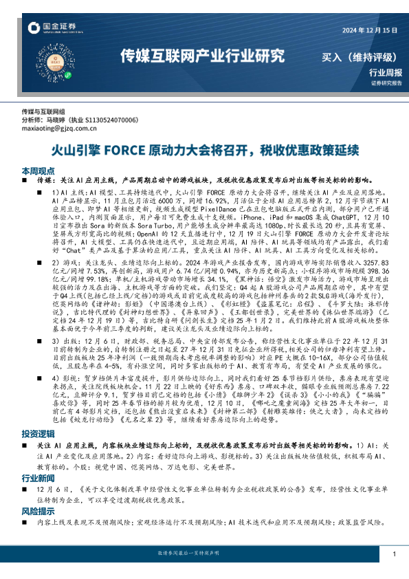 【国金证券】【20241215】传媒互联网产业行业研究周报:火山引擎FORCE原动力大会将召开,税收优惠政策延续-11页