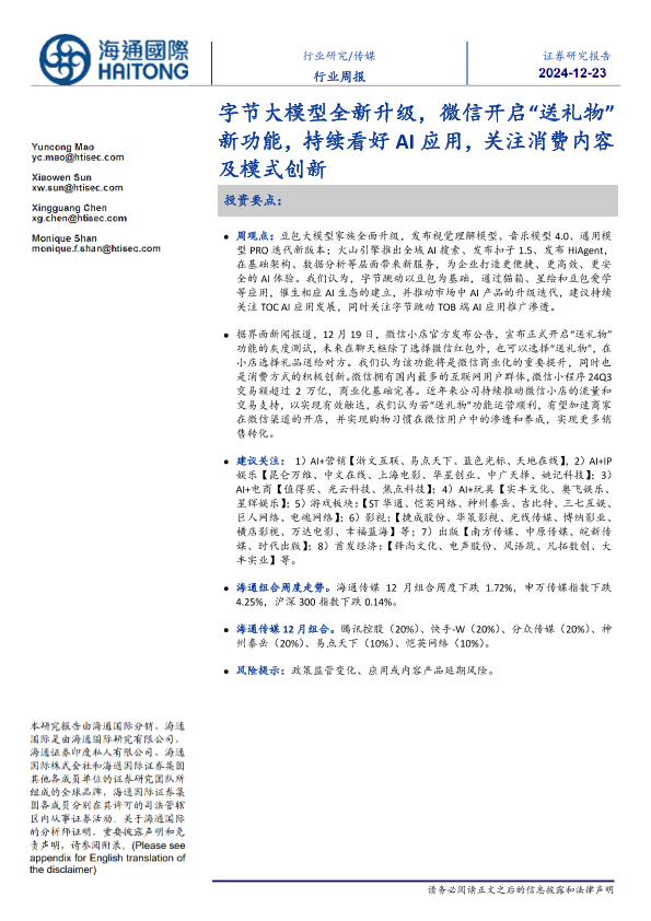 【海通国际】【20241222】传媒行业周报:字节大模型全新升级,微信开启“送礼物”新功能-10页