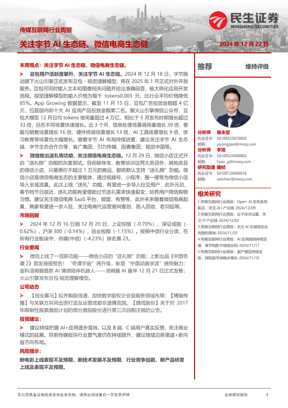 【民生证券】【20241222】传媒互联网行业周报:关注字节AI生态链、微信电商生态链-17页