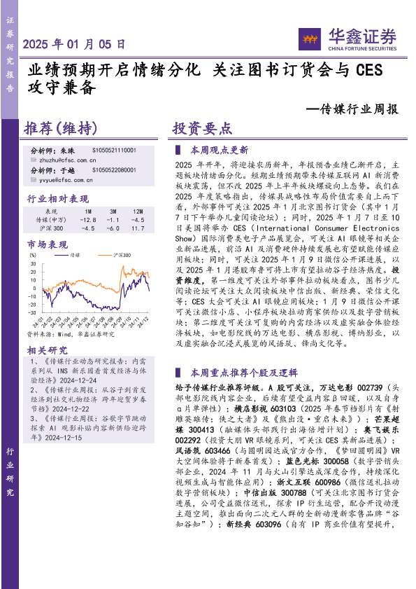 【华鑫证券】【20250105】传媒行业周报:业绩预期开启情绪分化 关注图书订货会与CES攻守兼备-20页