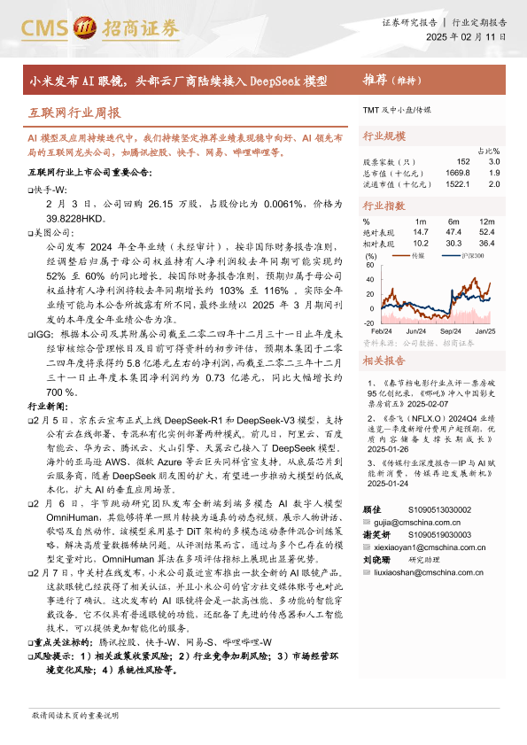 【海通证券】【20250211】互联网行业周报:小米发布AI眼镜,头部云厂商陆续接入DeepSeek模型-10页