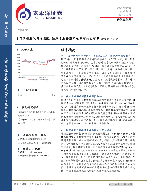 【太平洋证券】【20250223】1月游戏收入同增28%,阶跃星辰开源两款多模态大模型-20页