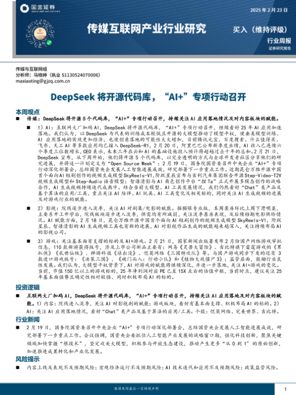 【国金证券】【20250223】传媒互联网产业行业周报:DeepSeek将开源代码库,“AI+”专项行动召开-11页