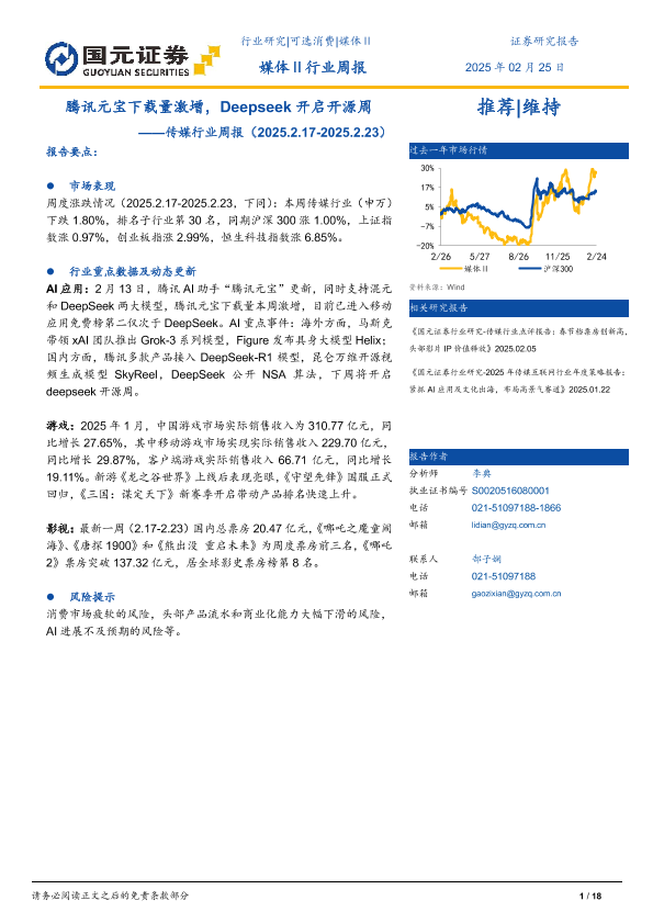【国元证券】【20250225】传媒行业周报:腾讯元宝下载量激增,Deepseek开启开源周-18页