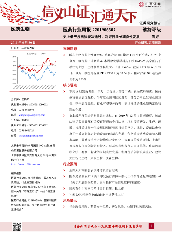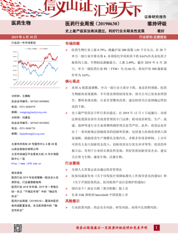 【山西证券】【20190630】医药行业周报:史上最严疫苗法表决通过,利好行业长期良性发展-8页